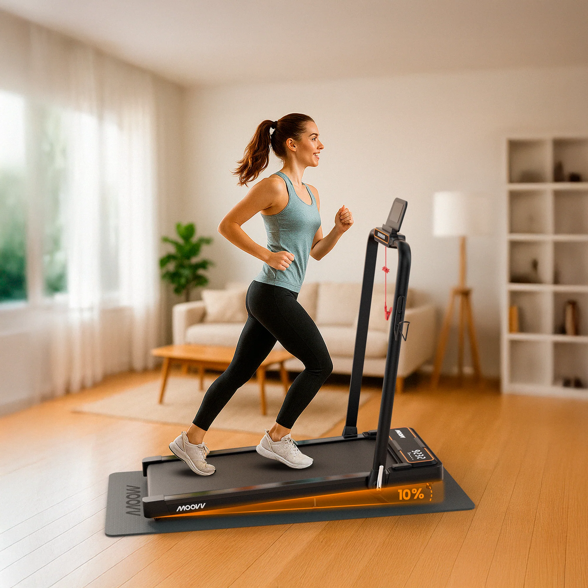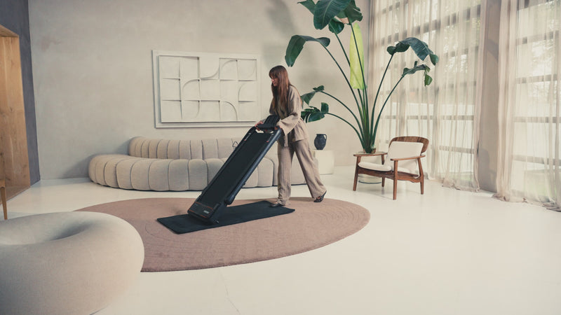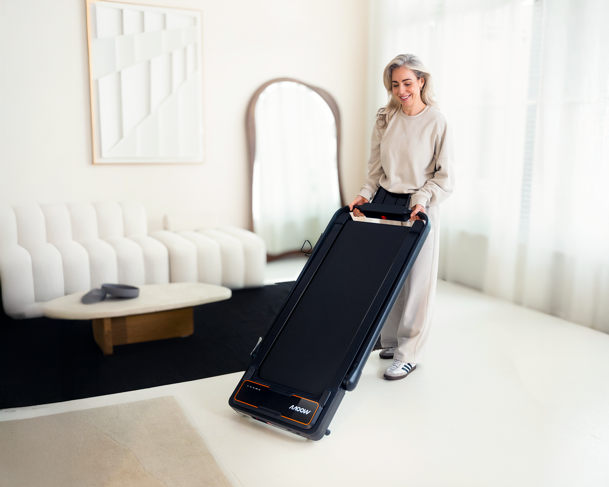 Geen grote fitnessapparaten in je woonkamer. De Moovv loopband berg je eenvoudig op met de wielen aan de onderkant, direct onder je bank of bed.